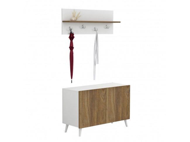 Το σετ εισόδου DELPHINE αποτελείται από μια παπουτσοθήκη-ντουλάπι με ψηλά πόδια με δύο πόρτες και ενιαίο χώρο αποθήκευσης και μια κρεμάστρα τοίχου με ράφι.
