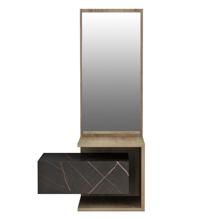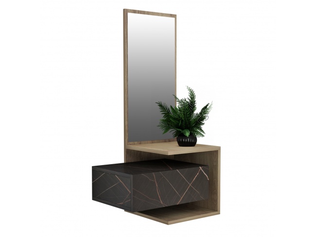 Διαθέτει έναν καθρέπτη, ανοιχτούς χώρους τοποθέτησης αντικειμένων, και ένα συρτάρι, σε πανέμορφη διχρωμία ΦΥΣΙΚΟΥ-ΜΑΥΡΟΥ ΜΑΡΜΑΡΟΥ.