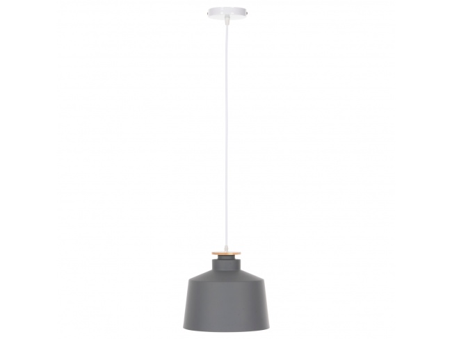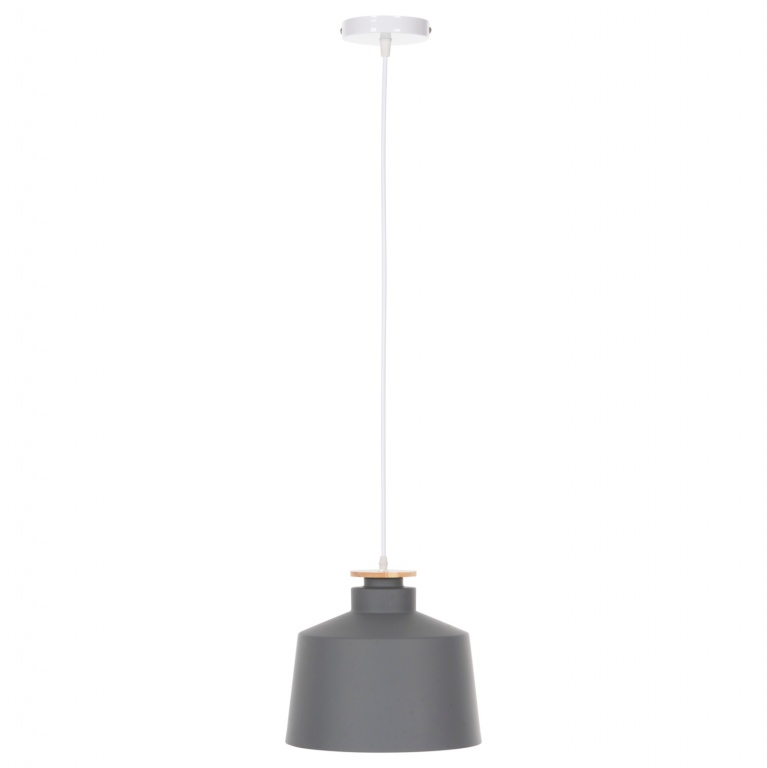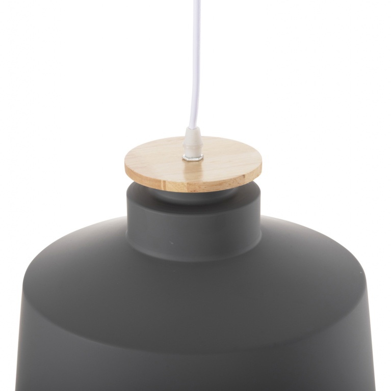 Πρόκειται για ένα φωτιστικό με ΓΚΡΙ καπέλο ΑΛΟΥΜΙΝΙΟΥ σε σχήμα καμπάνας με λεπτομέρεια ξύλου στην κορυφή του φωτιστικού.