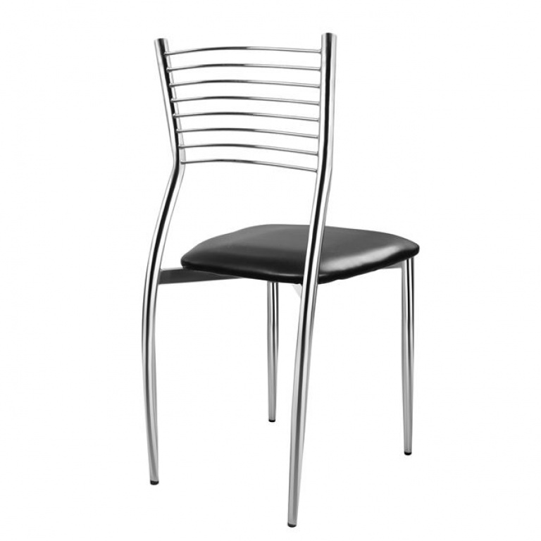 Καρέκλα τραπεζαρίας από σκελετό χρωμίου και επένδυση από δερματίνη σε μαύρο χρώμα.