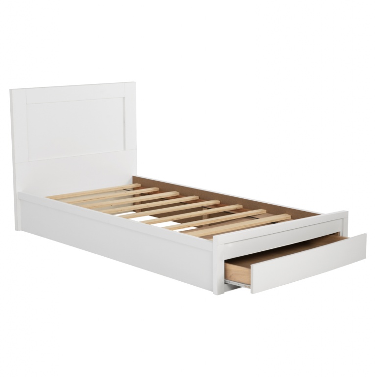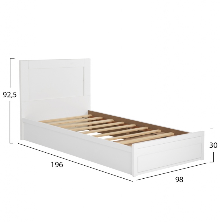 Το κρεβάτι MELANY σε διάσταση για μονό στρώμα 90x190 εκ., είναι μια άριστης ποιότητας, κλασική και ασφαλής επιλογή που θα ταιριάξει σε κάθε υπνοδωμάτιο. Το χαρακτηριστικό του είναι ότι πατάει απευθείας στο δάπεδο και εκμεταλλεύεται τον χώρο κάτω από τις τάβλες του σομιέ με 1 μεγάλο συρτάρι που βγαίνει από την πλευρά του «ποδαρικού» (η επιφάνεια απέναντι από το κεφαλάρι). Όλες οι γωνίες είναι τετραγωνισμένες χωρίς καμία καμπύλη, ενώ το ΛΕΥΚΟ χρώμα είναι ευχάριστο και ουδέτερο, και μπορεί να συνδυαστεί με πληθώρα διακοσμητικών μοτίβων στον χώρο σας.
