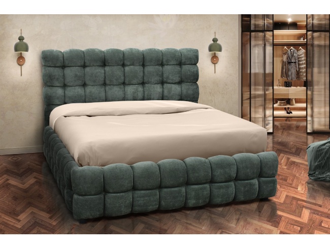 Κρεβάτι με ιδιαίτερο καπιτονέ σχέδιο τόσο στο κεφαλάρι όσο και στη βάση του.