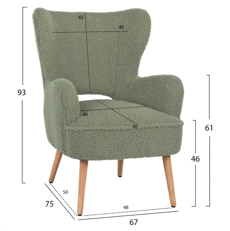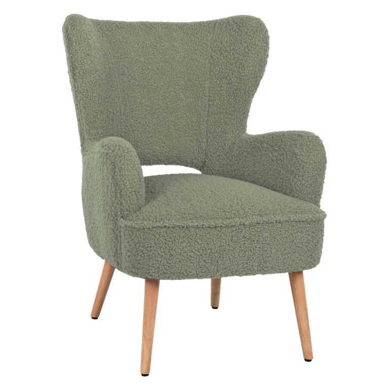 Η ψηλή πλάτη με το άνοιγμα χαμηλά πίσω, και η σχεδόν “bucket” σχεδίαση, προσδίδουν ιδιαίτερη ομορφιά στην πολυθρόνα σε συνδυασμό, φυσικά, με το υψηλής ποιότητας μπουκλέ ύφασμα.