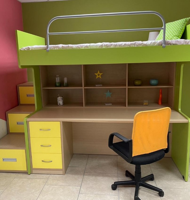 Νεανική κουκέτα αποτελούμενη από κρεβάτι, βιβλιοθήκη, γραφείο, κάγκελο και σκάλα, σε μοντέρνο σχέδιο με συνδυασμό χρωμάτων.
