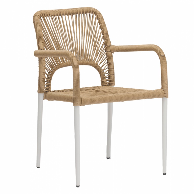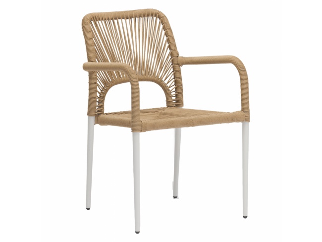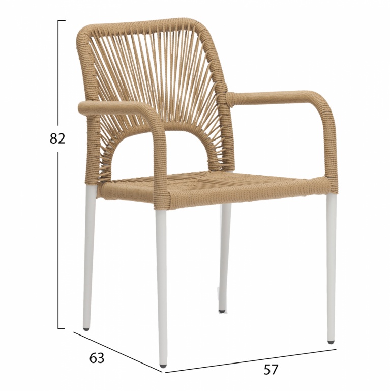 Μοντέρνα πολυθρόνα, κατασκευασμένη από σκελετό αλουμινίου σε λευκή απόχρωση, επενδυμένη με πλεκτό ενισχυμένο PE σχοινί στο κάθισμα και στην πλάτη σε μπεζ απόχρωση.