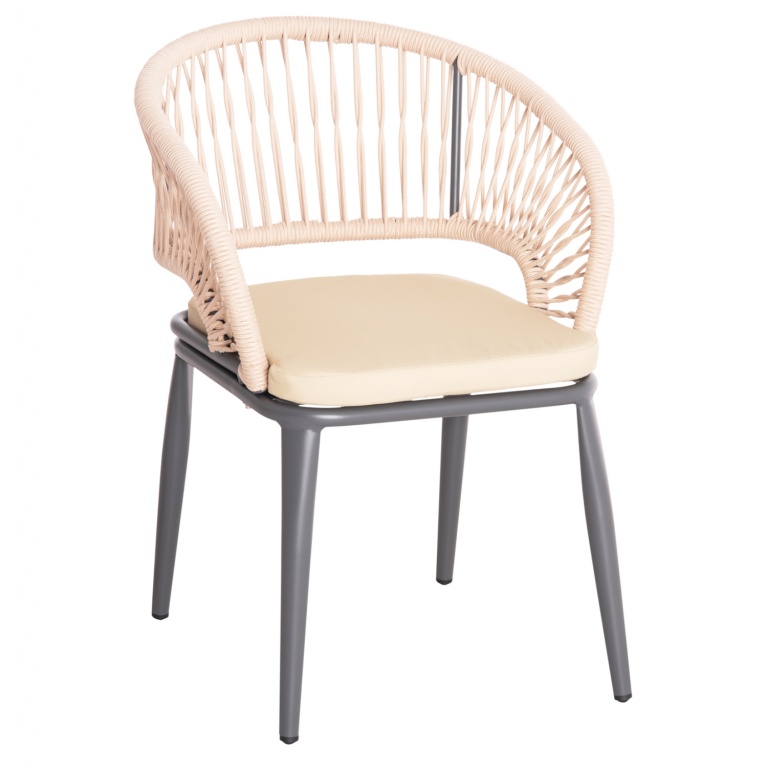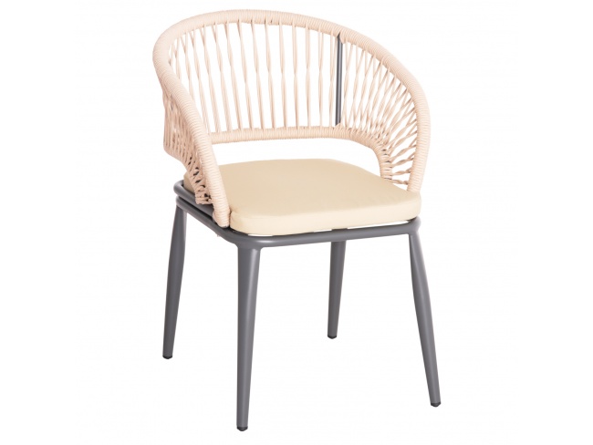 Η πολυθρόνα MAGNET είναι σχεδιασμένη να αγκαλιάζει το σώμα χάρη στην ημικυκλική πλάτη που είναι επενδυμένη με πολυεστερικό σχοινί terylene σε χρώμα ΚΡΕΜ.