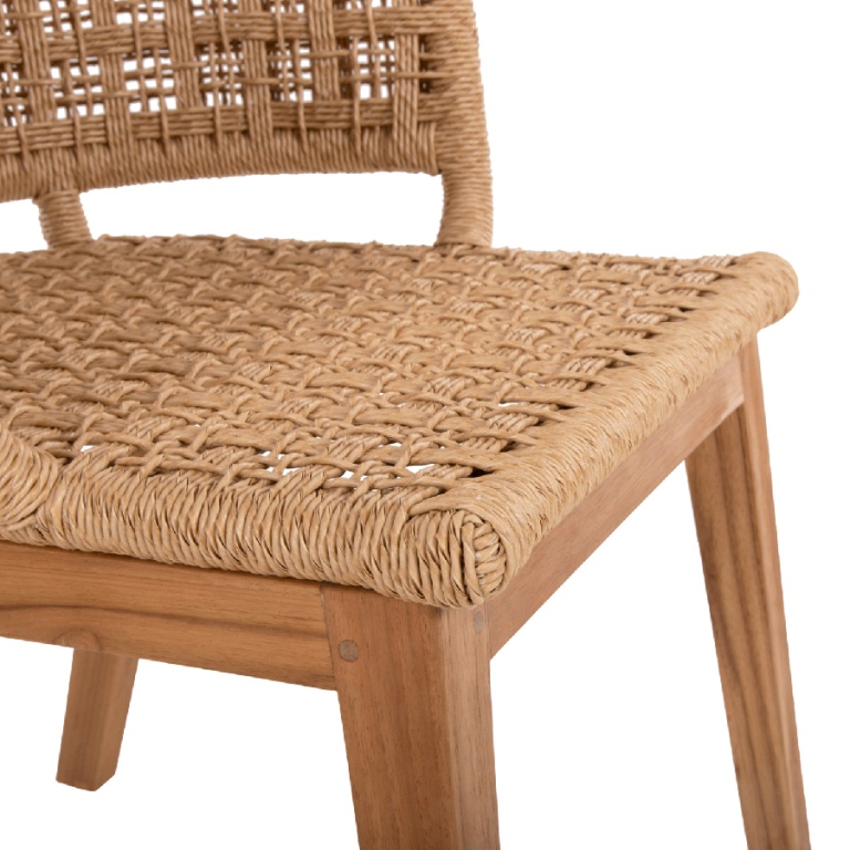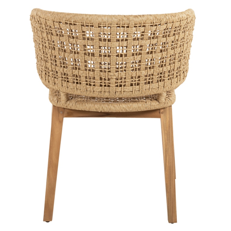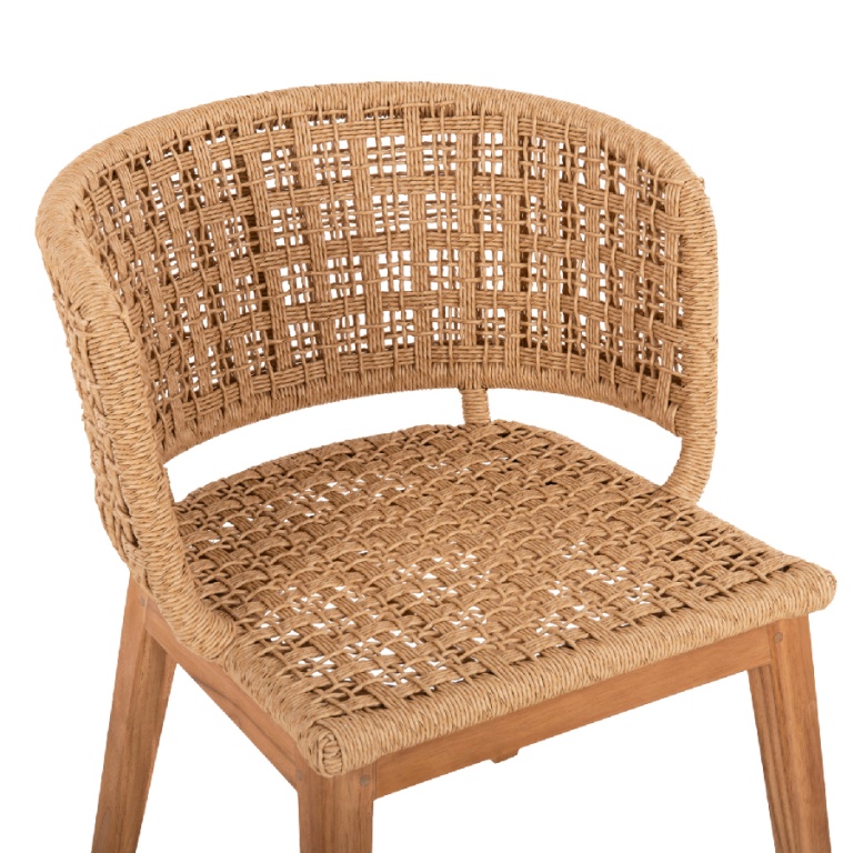 Ο κλασσικός σκελετός της με τις ορθές γωνίες είναι από ποιοτικό ξύλο, ενώ τόσο η μεσαίου ύψους κυρτή πλάτη όσο και το φαρδύ κάθισμα αποτελούνται από αριστοτεχνικά πλεγμένο συνθετικό σχοινί άριστης ποιότητας σε φυσικό χρώμα.