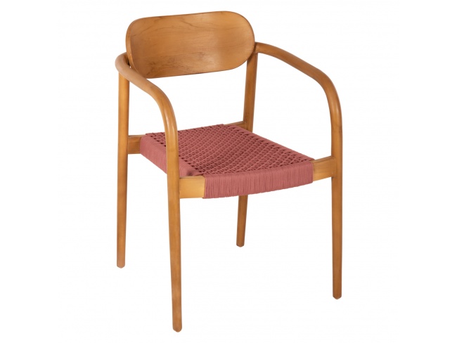 Ο σκελετός της με τις καμπύλες στα μπράτσα είναι από ποιοτικό ξύλο, όπως και η μεσαίου ύψους «ιδιαίτερη» πλάτη, ενώ το φαρδύ κάθισμα αποτελείται από αριστοτεχνικά πλεγμένο σχοινί άριστης ποιότητας σε ΡΟΖ χρώμα.