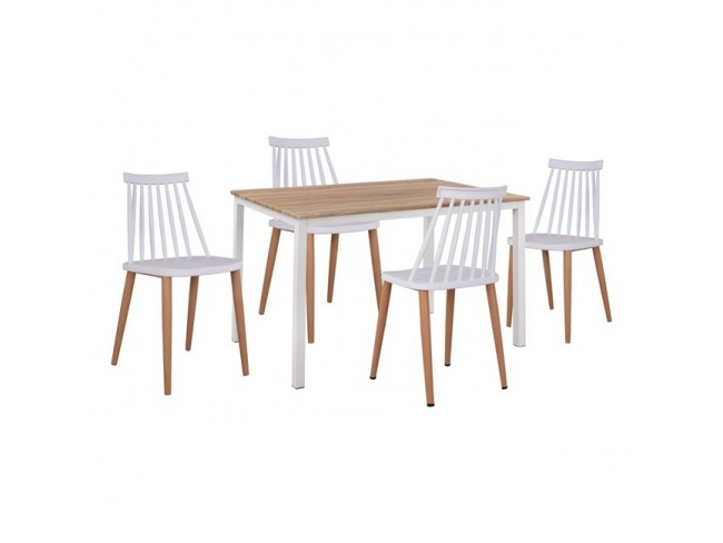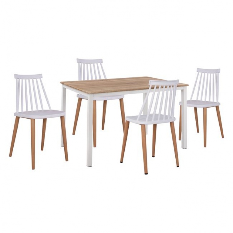 -Τέσσερις καρέκλες με κάθισμα από πολυπροπυλένιο σε λευκή απόχρωση και μεταλλικά πόδια με απόδοση στο φυσικό χρώμα του ξύλου.
