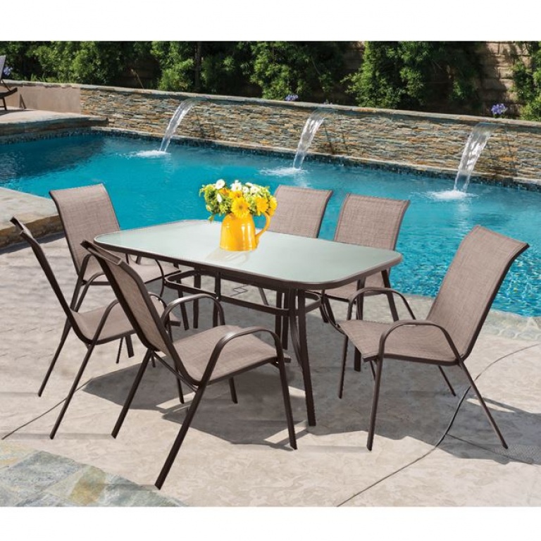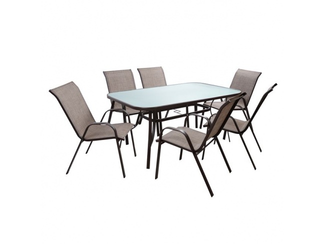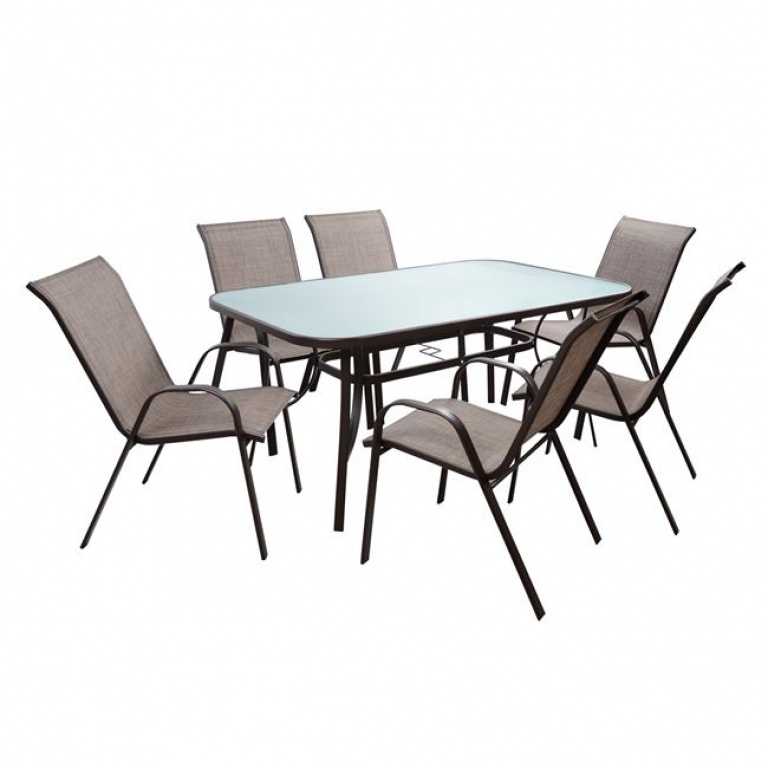 Ένα τραπέζι μεταλλικό εξωτερικού χώρου σε χρώμα καφέ, με ενσωματωμένο τζαμί ασφάλειας (secure).