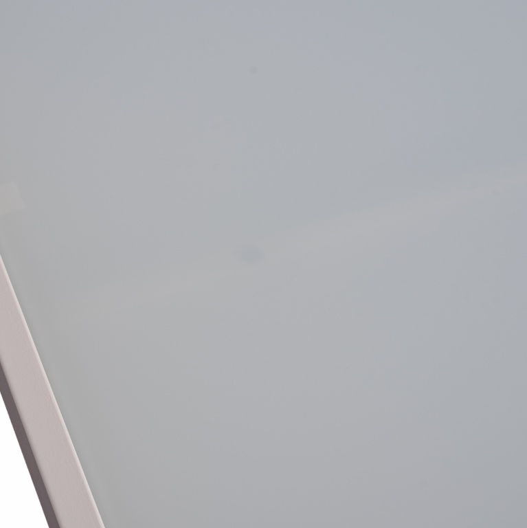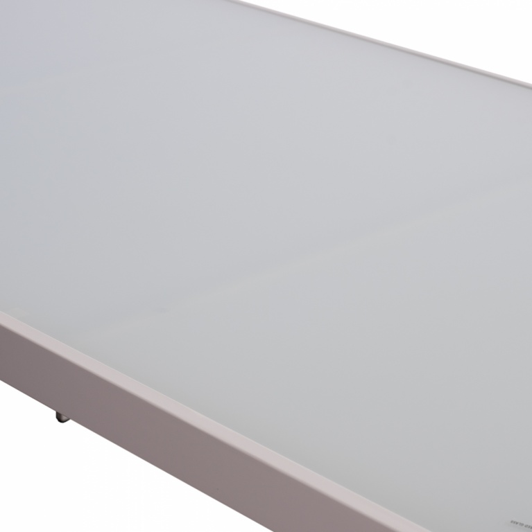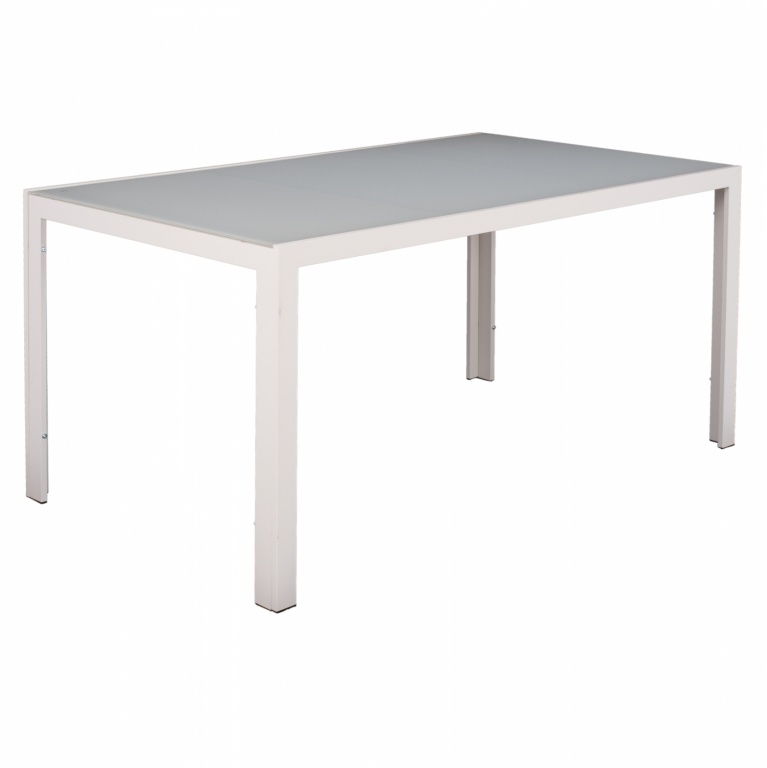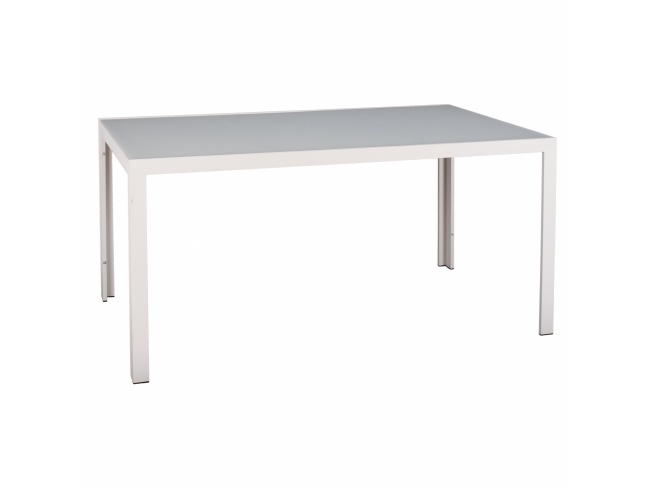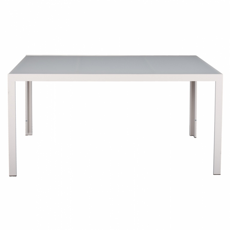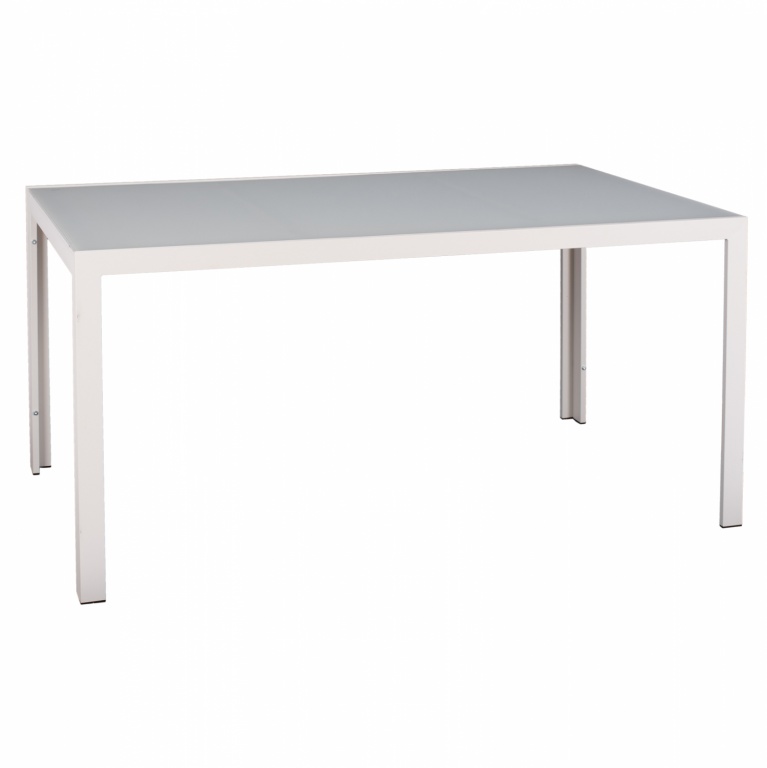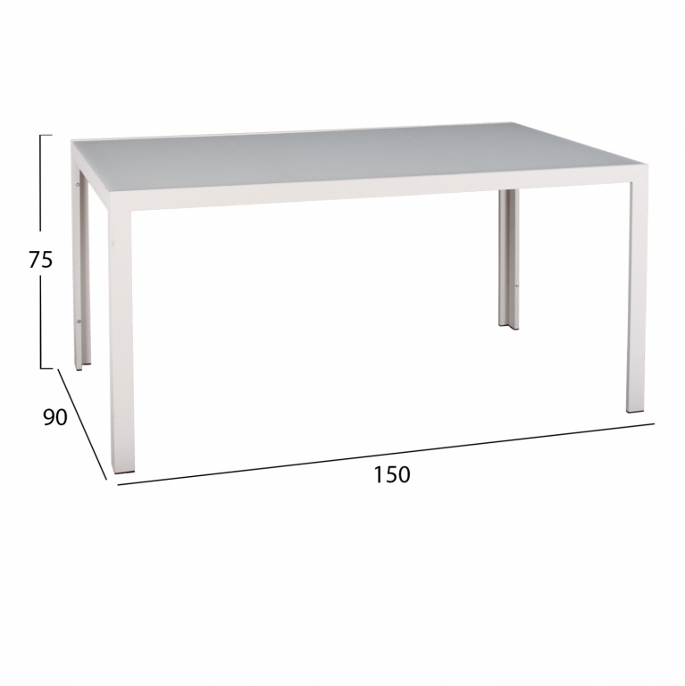 Τραπέζι εξωτερικού χώρου μεταλλικό σε λευκή του πάγου απόχρωση με γυαλί στην επιφάνειά του.
