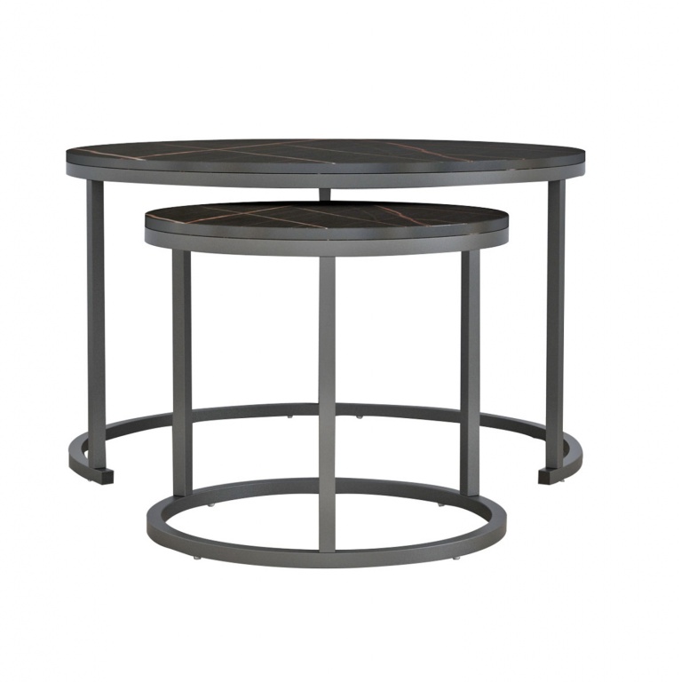 Οι βάσεις και των δύο τραπεζιών είναι μεταλλικές σε μαύρο χρώμα, ενώ οι επιφάνειές τους είναι σε απομίμηση μαύρου μαρμάρου από MDF.