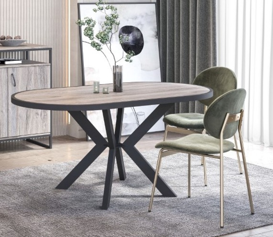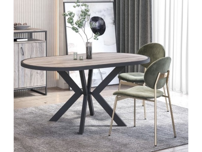 Τραπέζι τραπεζαρίας οβάλ από μελαμίνη, ελληνικής κατασκευής με μεταλλικό πόδι.